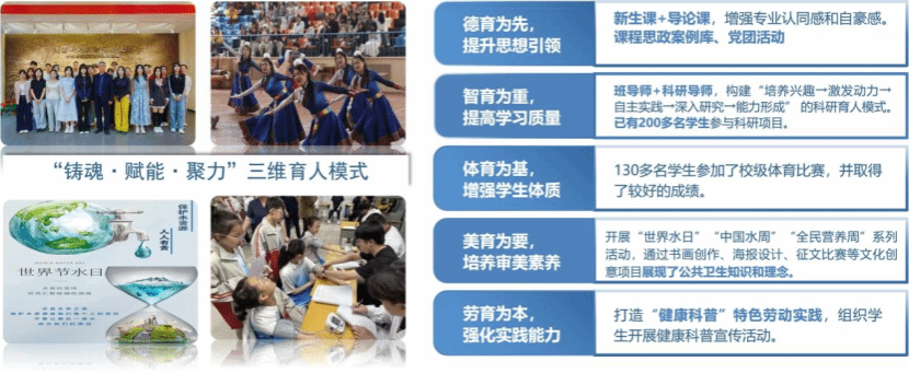 通过“辅导员+班导师+科研导师”三位一体的指导模式,为学生提供全面的学业规划,积极探索并构建“培养兴趣→激发动力→自主实践→深入研究→能力形成”的科研育人链条;同时,鼓励学生积极参与校级以上体育赛事及公共体育部组织的各类体育活动,增强学生体质;开展“全民营养周”“中国水周”等系列活动。通过书画创作、海报设计、征文比赛等多种文化创意项目,培养审美素养;将劳动教育有机融入健康科普实践教学体系,着力打造具有“健康科普”特色的劳动实践品牌。
