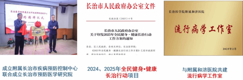 (三)构建了“政-行-校”的多元协同育人机制。学院以行业需求为导向,通过与高校、地方政府、疾控中心及医疗机构建立常态化合作平台,优势互补,资源共享,精准对接公共卫生领域的人才需求,培养适应行业发展的应用型人才。目前与长治市疾病预防控制中心成立长治医学院附属长治市疾病预防控制中心,建立预防医学研究院。与长治市政府合作,参与长治市2025全民健身˙健康长治行动项目,建立健康城市智库,开展流行病学调查,整合居民健康档案、医疗、医保等大数据,建立健康数字化平台,发布居民健康白皮书,进行健康需求的精准识别,带领学生开展健康教育(慢性病、营养膳食等)等健康促进项目,参与区域社会居民健康干预。与附属和济医院共建流行病学工作室,搭建临床科研协作交流的平台。