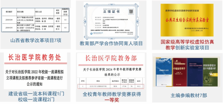 (二)完善的课程体系和教学改革。课程体系包括必修课程、选修课程和实践教学环节。科学整合专业核心课程的理论与实验内容,强化理论与实践融合,积极开展PBL教学、情景模拟教学,不断提升学生专业知识综合运用能力、综合素质与核心竞争力。目前学院有省级一流本科课程1门,省级教学成果二等奖1项。近三年来,成功获批山西省高等学校科技创新平台——环境因素与人群健康实验室平台1项,全国高等学校虚拟仿真教学创新实验室——公共卫生综合实践仿真实验室建设项目1项,承担教育部产学合作协同育人项目1项,立项山西省教学改革项目7项,主编参编《临床流行病学》《循证医学》《医学统计学》《预防医学》等教材7部。这些成果为培养应用型公共卫生人才提供了有力支撑。