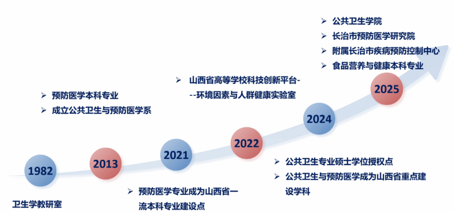 长治医学院公共卫生学院经过数十年的稳步发展,其历史可追溯至1982年成立的卫生学教研室,为学科建设奠定了坚实基础。2013年,在原有基础上成立了公共卫生与预防医学系,并于同年获得批准招收预防医学本科专业。2021年,成功获批山西省高等学校科技创新平台——环境因素与人群健康实验室。2022年,预防医学专业入选山西省一流本科专业建设点,专业与科研平台实力显著增强。2024年,学院获得公共卫生专业硕士学位授权点,公共卫生与预防医学成为山西省重点建设学科。同年,食品营养与健康本科专业(学制4年)获批,形成了“本科-硕士”两级人才培养体系。2025年,学院正式更名为公共卫生学院,与长治市疾病预防控制中心共建“长治医学院附属疾病预防控制中心”,联合成立“长治市预防医学研究院”,实现了教学、科研、社会服务的深度融合,标志着学院迈入全面发展的新阶段。