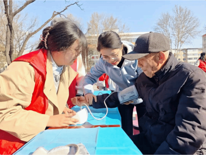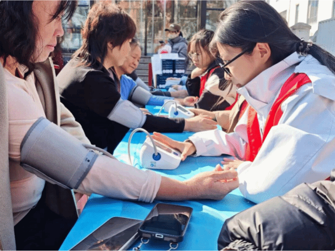 活动现场分基础健康检测、专业专家咨询、健康宣教互动等区域 ,各区域分工明确、衔接有序 ,志愿服务高效开展。 师生志愿者们耐心为居民免费提供血压测量、身高体重检测及 BMI 指数测算等基础服务 ,细致记录每一项健康数据 ,并即时向居民反馈检测结果、给出基础健康提⽰; 党员教师们围绕慢性病规范管理、春季传染病预防、科学营养膳食搭配等居民普遍关心的健康问题 ,提供一对一专属咨询指导 ,结合居民身体状况给出个性化的健康调理建议;健康宣教互动区通过健康知识问答等趣味形式 ,向居民普及科学养生、 日常疾病防控等实用常识 ,生动易懂的讲解和趣味互动吸引了众多居民踊跃参与 ,现场气氛热烈融洽。